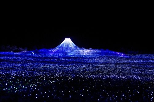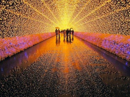 場景一:冬日燈彩平常到位於日本桑名市(Kuwana)的花之里公園(Nabana no Sato),滿坑滿谷的鬱金花田,讓人誤以為到了絕美的荷蘭,但從年末到隔年三月,這裡除了色彩繽紛的花朵外,最有看頭的就是融合日本意象特色的燈光展覽「冬日燈彩」(Winter Illuminations)!今年的主題是「自然」,有人說此乃全日本最棒的燈光秀,使用大量的LED燈,妝點出炫目的夢幻燈光隧道,還有具銀河感的富士山夜景、彩虹等燈飾,讓花田閃閃發亮,盯著發亮的火樹銀花,彷彿來到了另一個時空,逛累了還能直接在這泡湯、吃大餐喔。